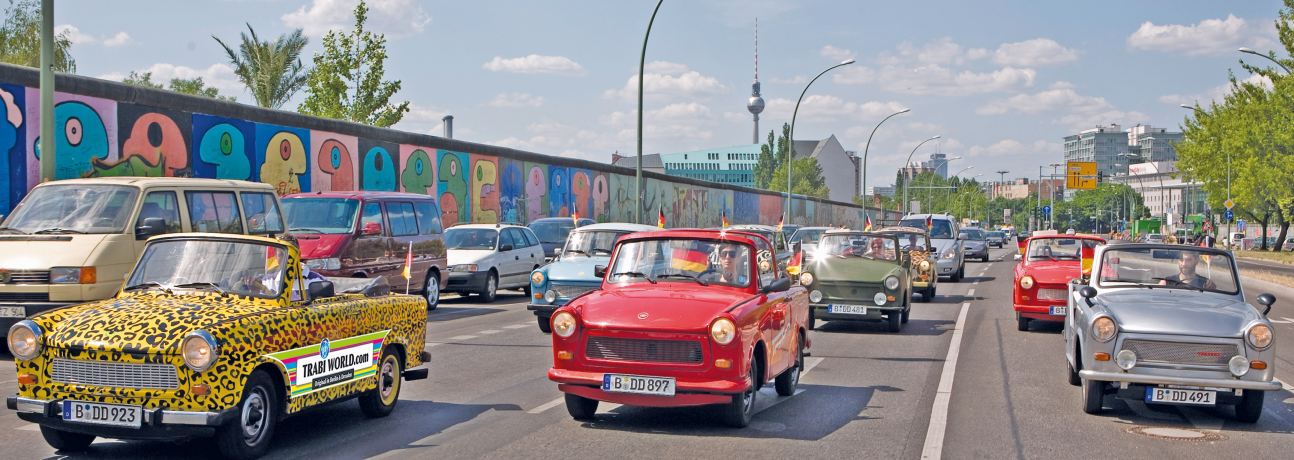 Unsere Tour beginnt am InterContinental Hotel, per Bustransfer geht es zum legendären Checkpoint Charlie, hier startet die Trabi-Safari. Nach einer kurzen Einführung in die Funktionsweise und die spezielle Gangschaltung der kultigen DDR-Autos kann es losgehen.